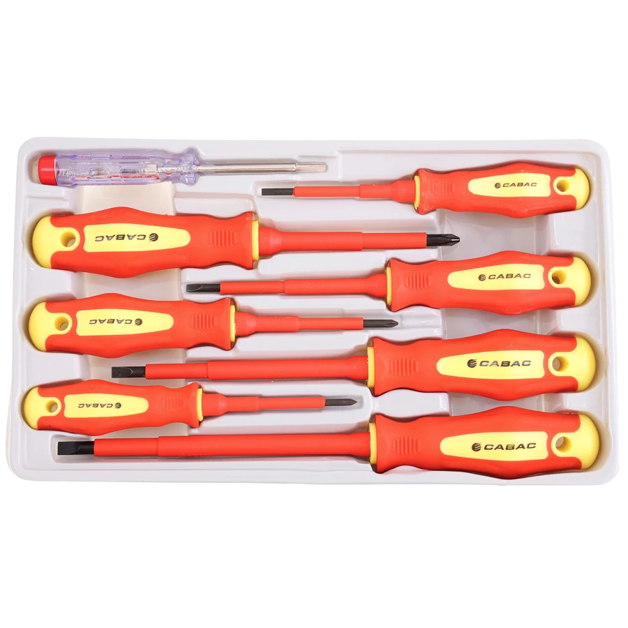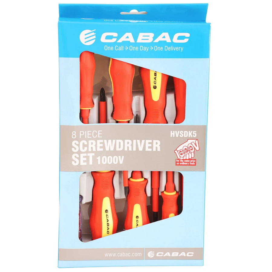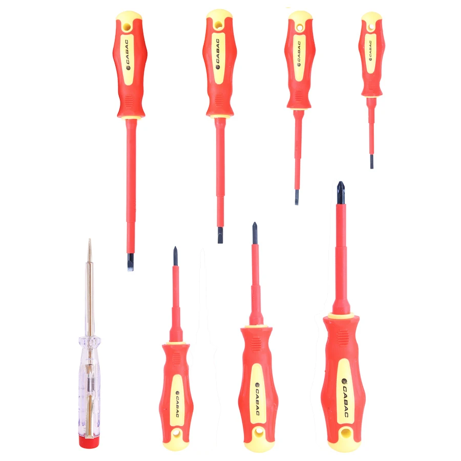 These Cabac 8 Piece Insulated Screwdriver Sets are fully insulated up to 1000V and the blades are made from high grade alloy steel. Set contains slotted screwdrivers 3.5 x 75mm, 4 x 100mm, 5.5 x 125mm & 6.5mm 150mm. Phillips screwdrivers PH0 x 75mm, PH1 x 80mm & PH2 x 100mm are also included, plus an electrical test screwdriver 120-250V.