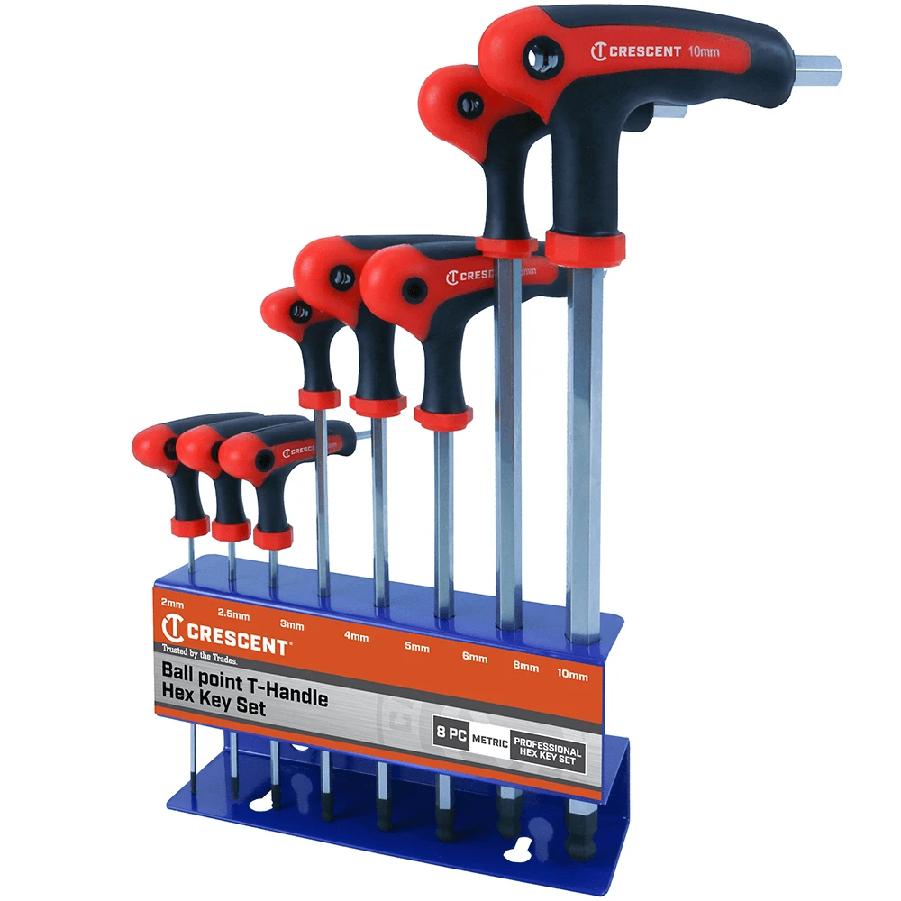 These Crescent Metric 8 Piece T-Handle Hex Key Sets are trade quality & ideal for professional use. Sizes include 2, 2.5, 3, 4, 5, 6, 8 & 10mm. Featuring a T-Handle grip for improved leverage & grip plus ball point ends for improved access.