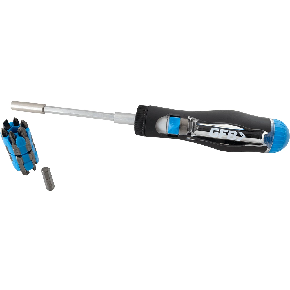 The GFB extendable ratchet screwdriver enables driving of screws in tight spaces. The 3 Way ratchet action ensures ease of use. The extendable ratchet screwdriver comes with 12 assorted tool bits included.
