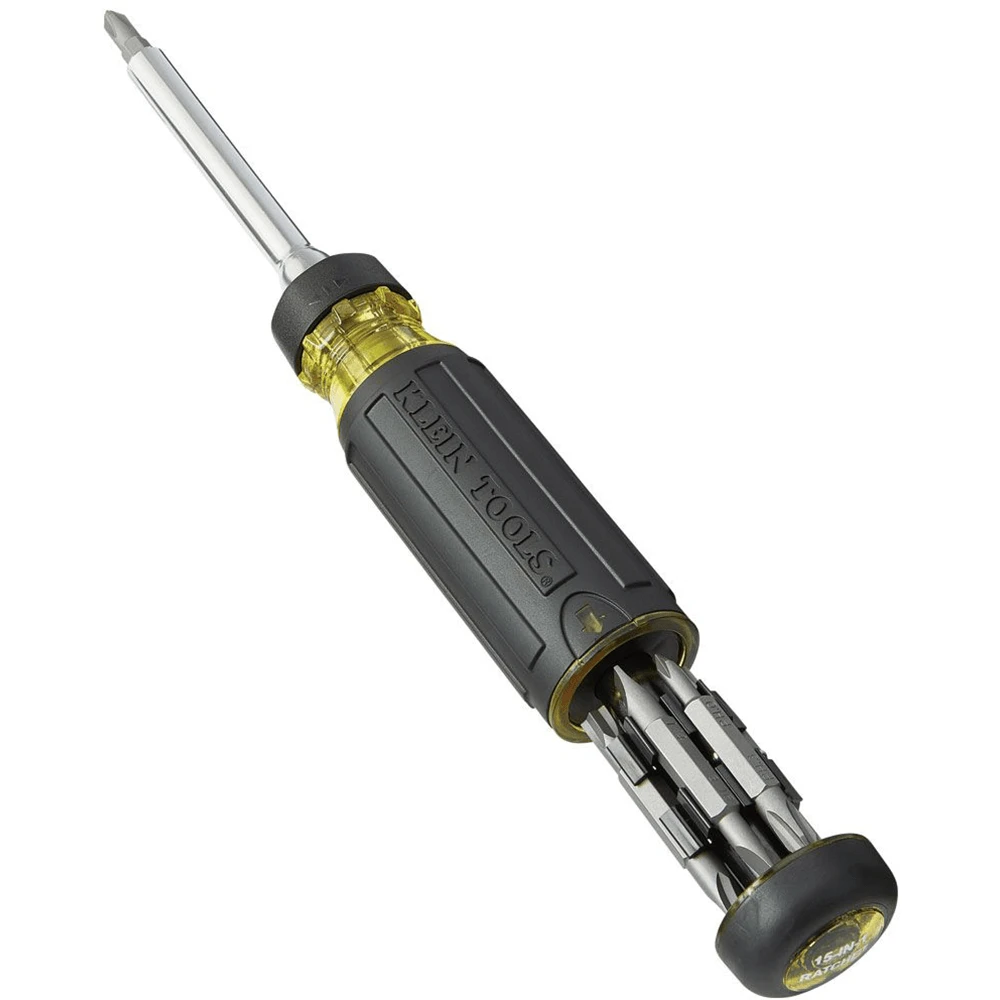 Klein Tools Multi-Bit Screwdrivers help make your job a little easier. The 15-in-1 Ratcheting Screwdrive’s durable ratcheting mechanism allows for faster & easier all-day driving. With the on-board storage of 14 common bits & a 1/4†nut driver, this is your new everyday screwdriver. This screwdriver features industrial-strength bits, as well as Cushion-Grip handles for outstanding comfort & control.