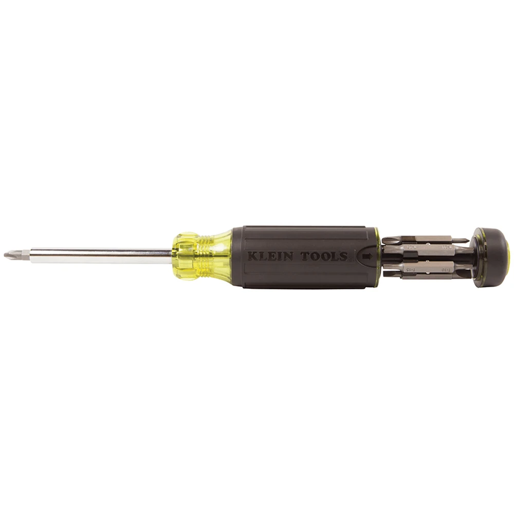 With Klein Tools 15-in-1 multi-bit screwdriver, carry fewer tools. This screwdriver / nut driver set comes with a fixed shaft & internal storage compartment for the screwdriver bits, so that they stay with the driver. 14 different bit sizes, plus a 1/4” nut driver, should cover all your bit needs.