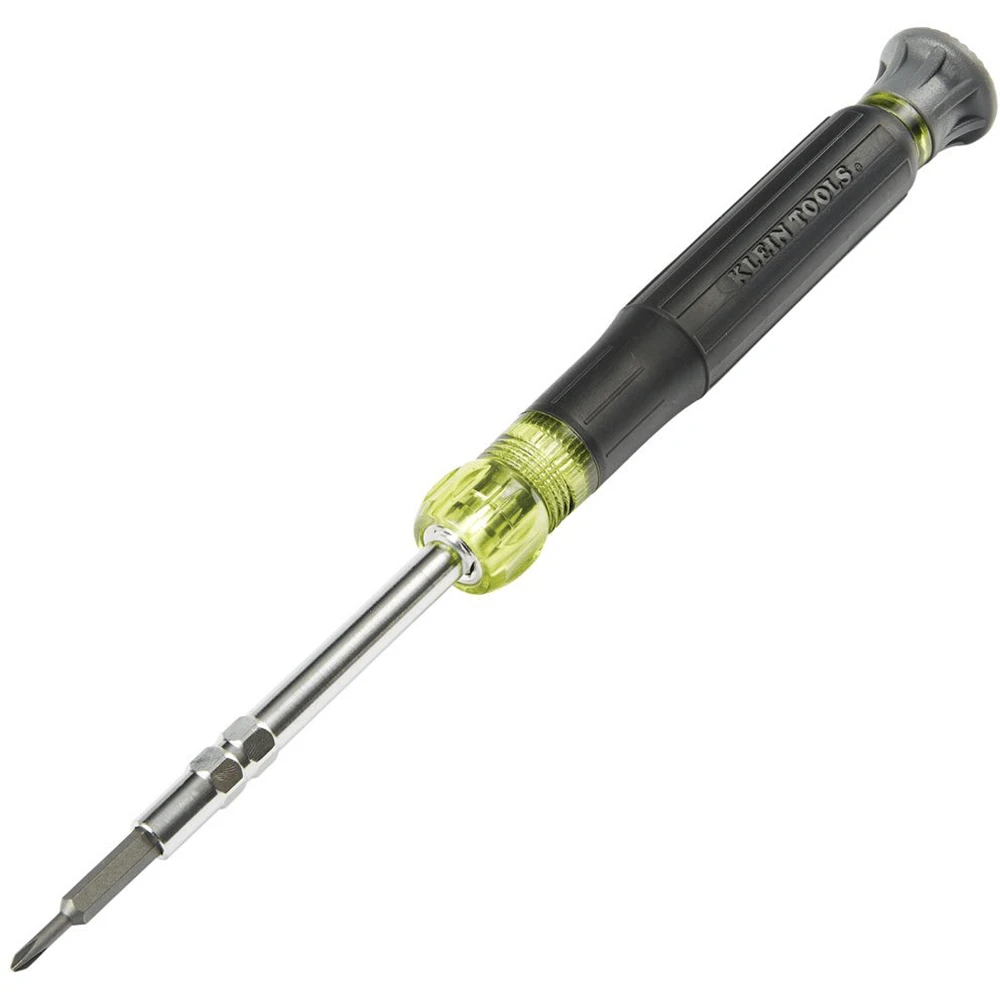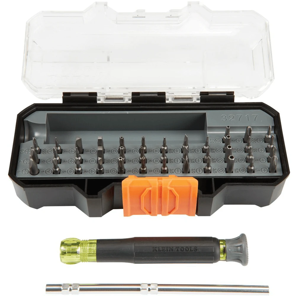 Klein Tools All-in-1 Precision Screwdriver Set with compact carrying case features 39 precision bits. This set provides everything you need to work with electronics & precision fasteners including those for Apple® products such as the Apple® iPhone, MacBook & Watch. The reversible barrel is standard on one side & extra-long on the other for those hard-to-reach jobs. Powerful magnets housed in the barrel better secure the bit, which also allows it to easily pick up & retain fasteners. The Cushion-Grip handle & spin cap provide outstanding comfort & control.
