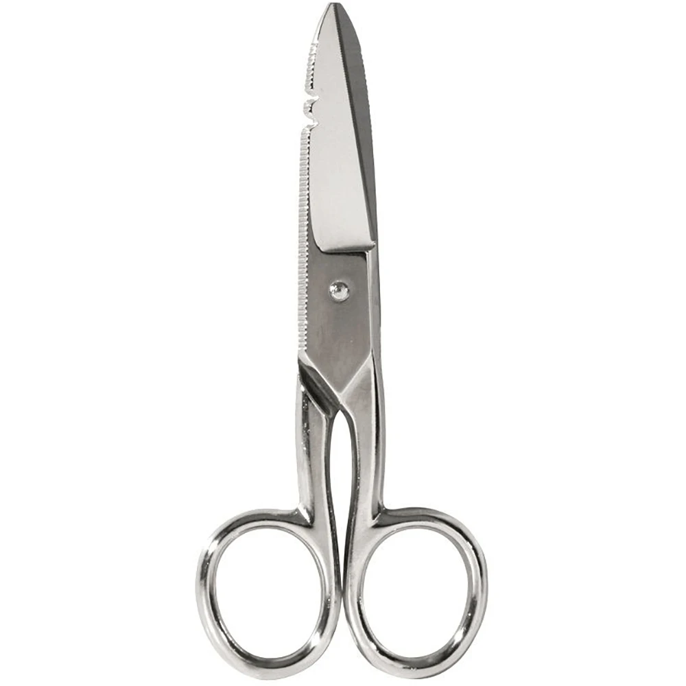 These Klein Tools Electrician’s Scissors with stripping notches are made for telecom & electrical applications. They cut wire, cable & cordage, including electrical communications 19 AWG & 23 AWG wire. The upper blade features wire-stripping notches. The serrated lower blade allows non-slip cutting action.