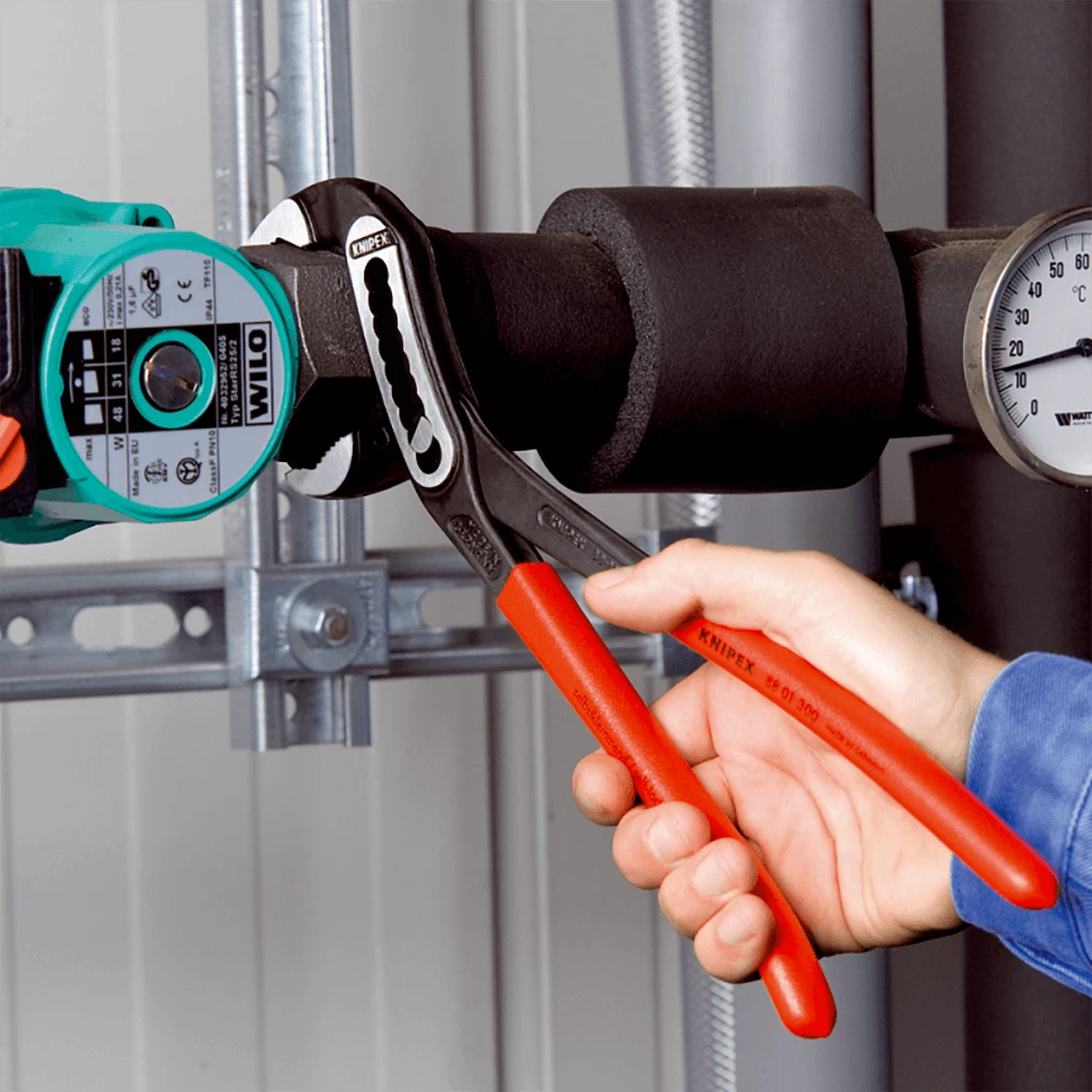 These Knipex Alligator Multi Grips are made from forged oil hardened chrome vanadium electric steel which means they are incredibly durable plus specially hardened teeth for greater wear resistance. 250mm long & featuring self-locking so there is no slipping & lower hand force required, box-joint design increasing stability & 9 adjustment positions for up to 30% more gripping capacity. With a maximum nut capacity of 46mm & maximum pipe capacity of 50mm. Made in Germany these Knipex Alligator Multi Grips are a perfect addition to any almost & toolbox or workshop.