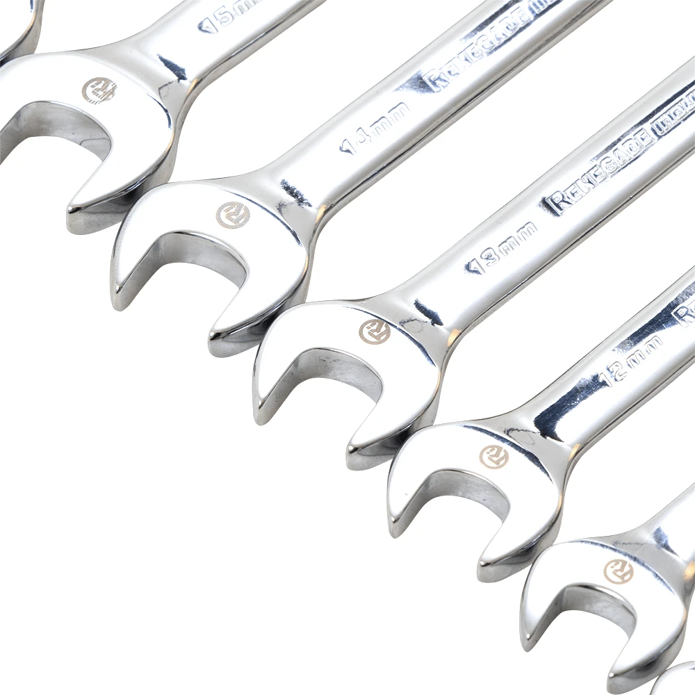 A superb quality Renegade Industrial full 12 Piece Metric Ratchet Spanner Set. Covers the full range from 8mm right up to 19mm. Features a very fine 72 tooth ratchet mechanism which ratchets at just 5 degree increments, a feature highly appreciated by the best mechanics. These ratchet spanners are very comfortable to use made more so by the highly mirror chrome finish & state of the art design.