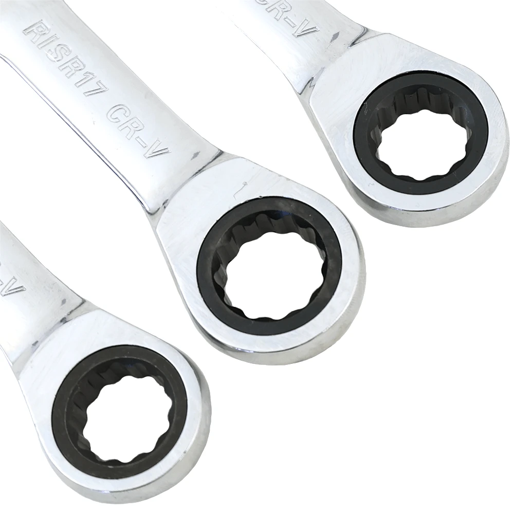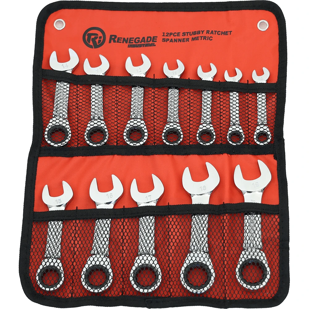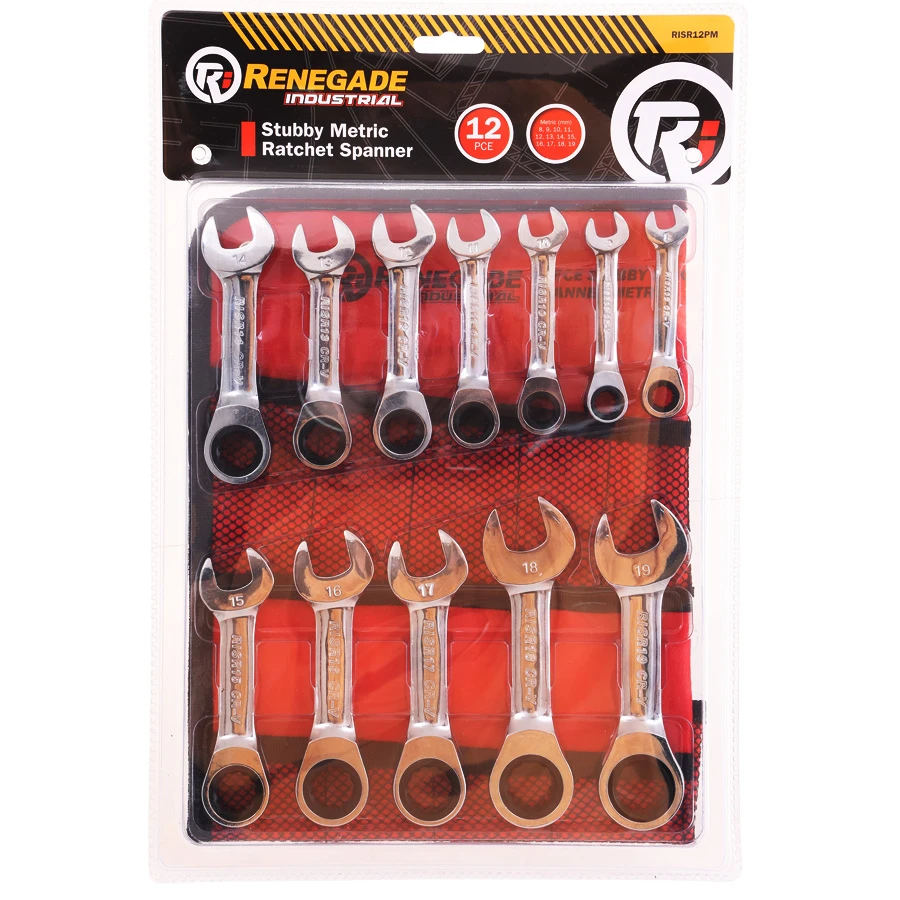 These Renegade Industrial Metric 12 Piece Stubby Ratchet Spanner Sets are trade quality & ideal for professional use. Each Piece in this set features a very fine 72 tooth ratchet mechanism which ratchets at just 5° increments, a feature highly appreciated by the best mechanics. They are made from quality chrome vanadium steel which provides greater strength & durability. These comfortable ratchet spanners are finished with a stunning high mirror chrome finish for looks that don’t disappoint. The set includes 12 Spanners ranging in size from 8mm – 19mm while the high-quality ratchet heads are star style for ease of use. A heavy-duty storage roll is also included to sort & store them when they aren’t in use.