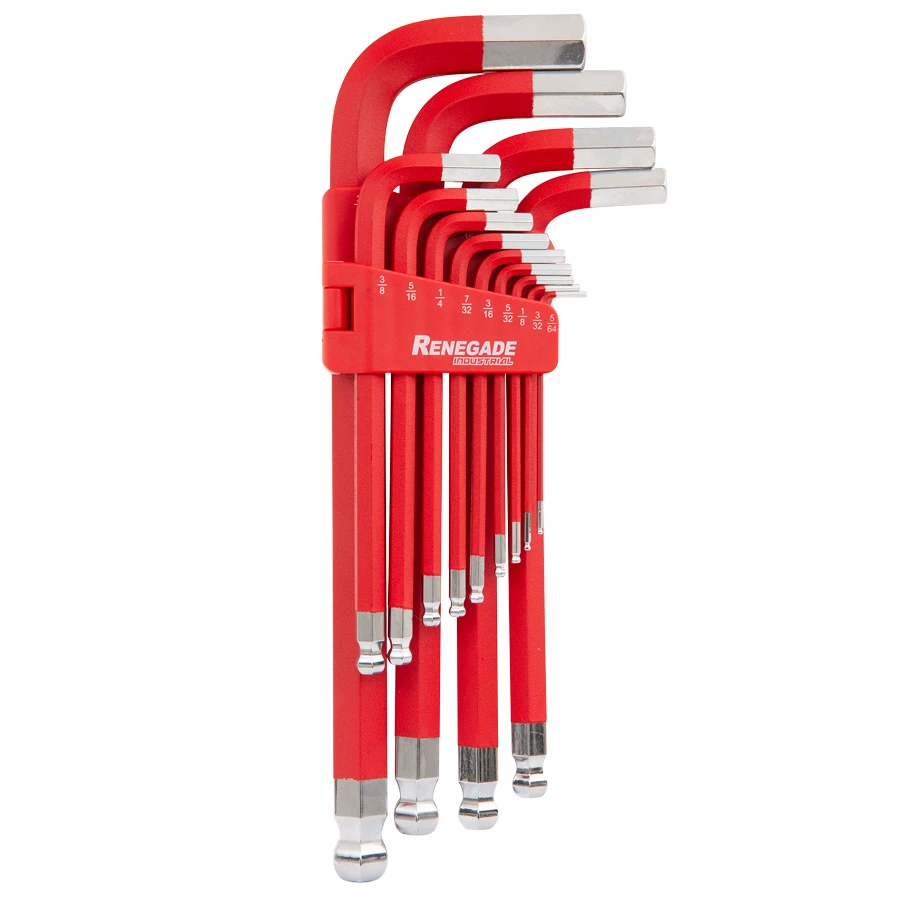 These Renegade Industrial Imperial Jumbo Hex Key Sets are trade quality and feature a convenient extra-long handle and ball end. Ideal for use on angles and for those hard to reach jobs. Sizes range from 5/64″ to 3/4″.