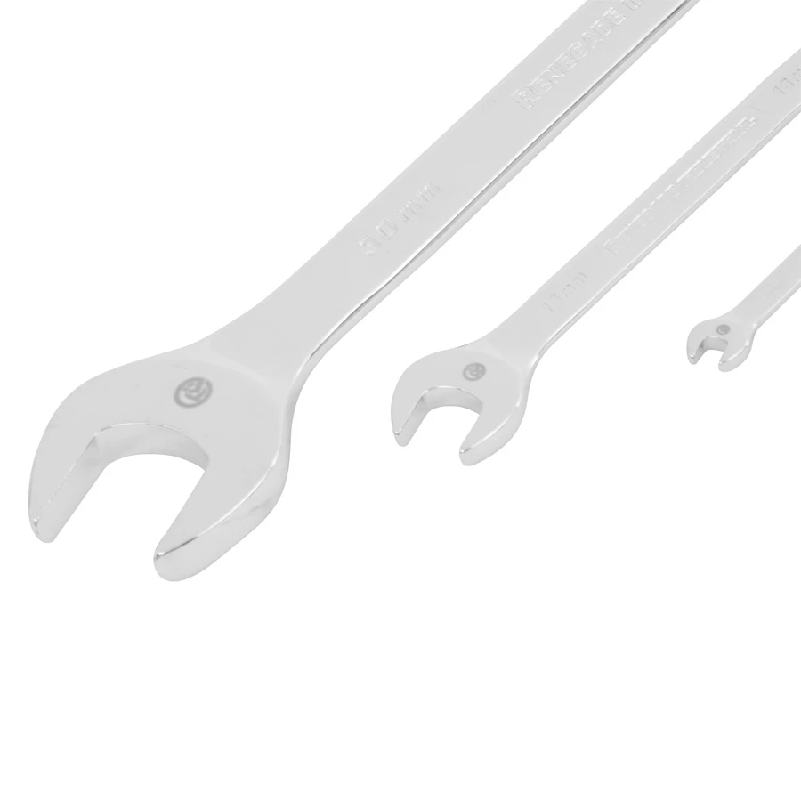These Renegade Industrial 24 Piece Metric Spanner Sets are trade quality & ideal for professional use. Covers the full range from 6mm right up to 30mm. These spanners are very comfortable to use made more so by the highly mirror chrome finish & state of the art design. Manufactured from drop forged chrome vanadium steel for extra strength & durability.