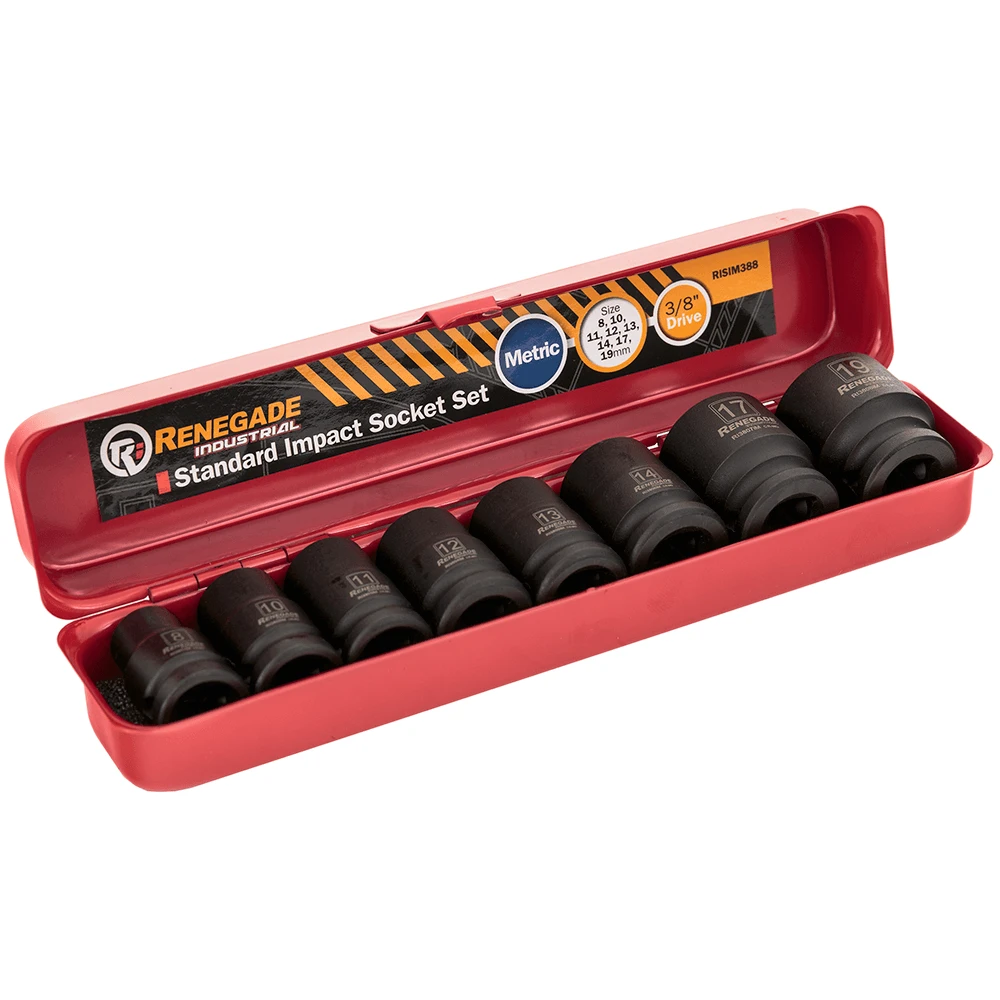 Manufactured from chrome molybdenum steel, the sockets in this 8 piece Renegade Industrial impact sets are made tough. They have been engineered for heavy duty use with impact tools and will be right at home on the worksite. Speed up assembly and disassembly time on machinery and equipment with this set that comes in a handy, portable metal case. Sizes are all imperial and range from 8mm all the way up to 19mm.