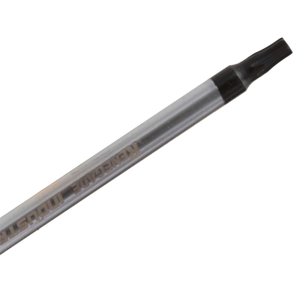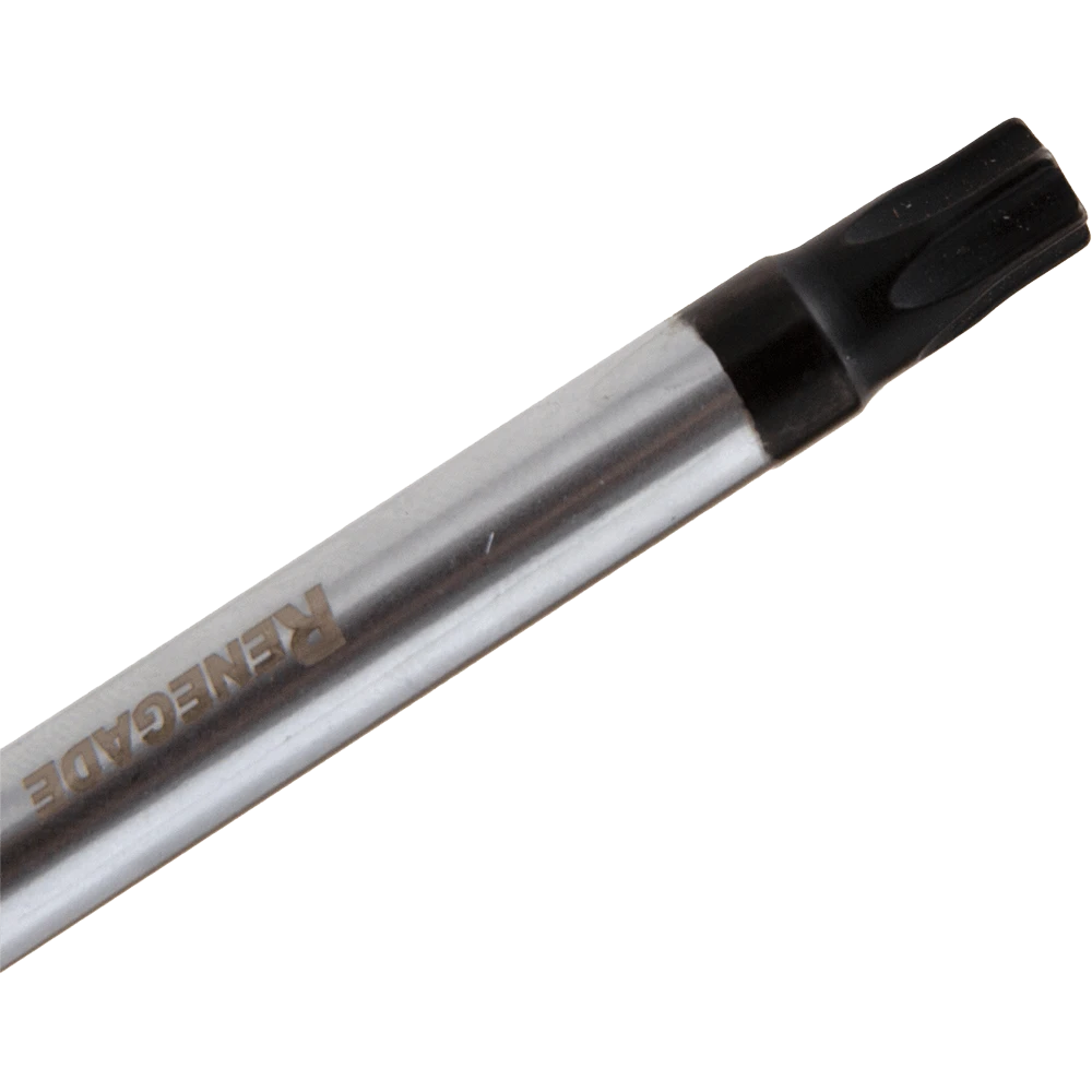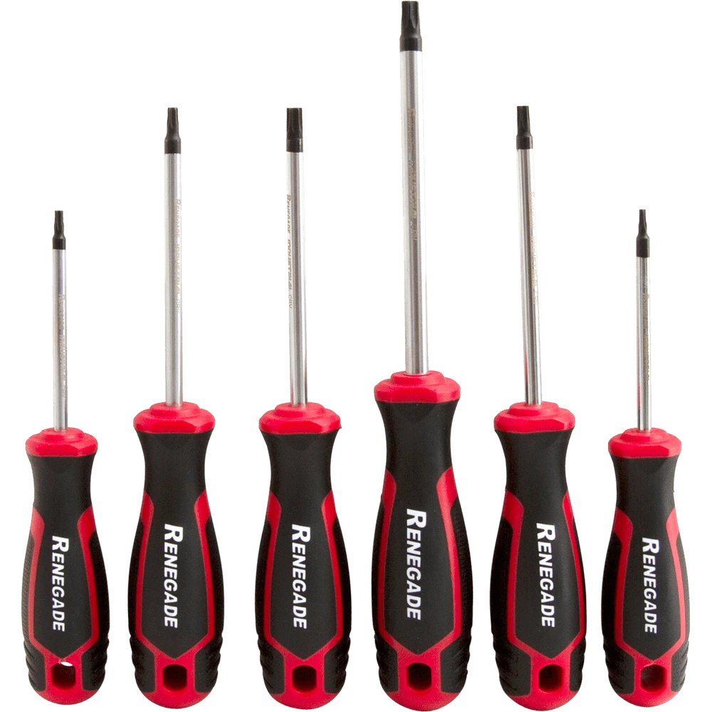 These Renegade Industrial 6 Piece Screwdriver Torx Sets are trade quality and ideal for professional use. The shaft is manufactured from quality chrome vanadium with chrome plated matt finish providing longer life and superb durability plus the end of the blade features a black magnetic tip. Includes T10 x 75mm, T15 x 75mm, T20 x 100mm, T25 x 100mm, T30 x 100mm & T40 x 125mm.