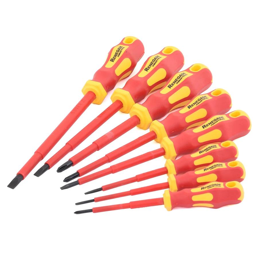 These Renegade Industrial 9 Piece Electrician Screwdriver Sets are trade quality & ideal for professional use. The end of the blades feature a black magnetic tip & the shaft is manufactured from quality chrome vanadium. This manufacturing process means they are insulated up to 1000 Volts, providing longer life, superb durability & protection.