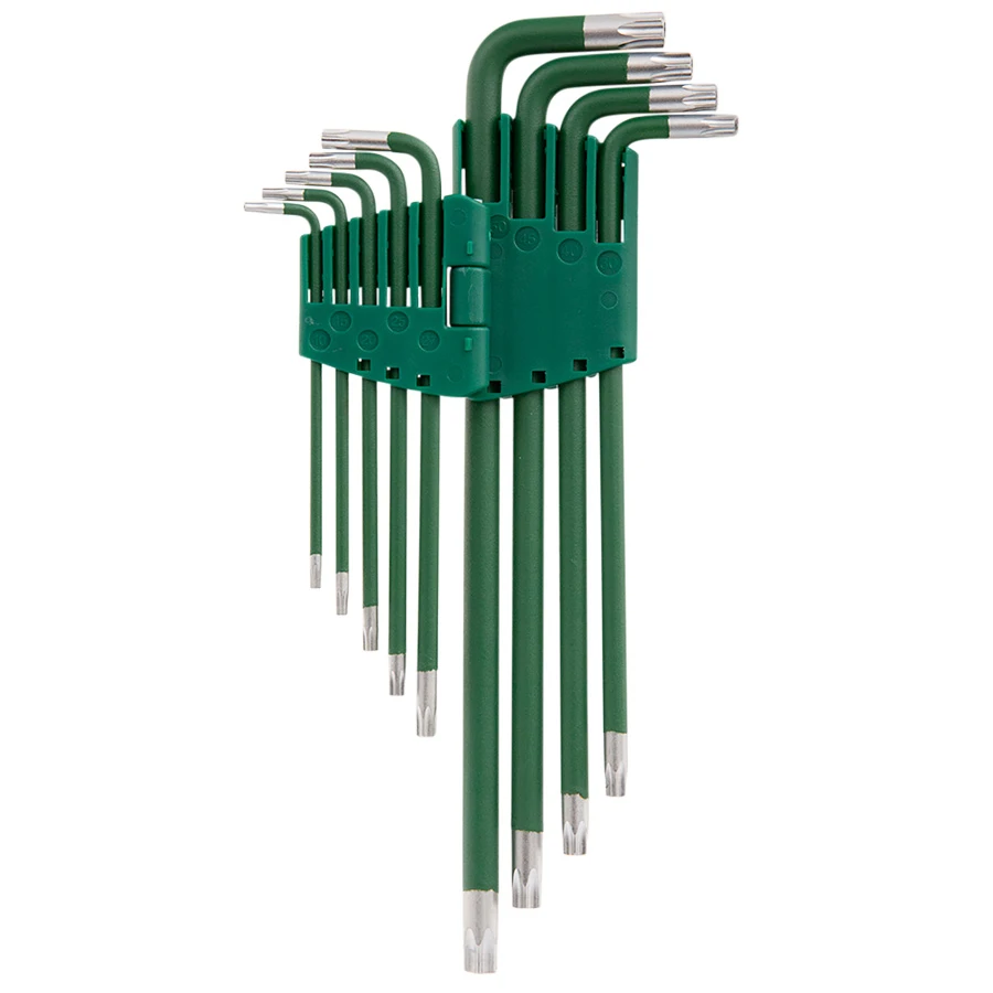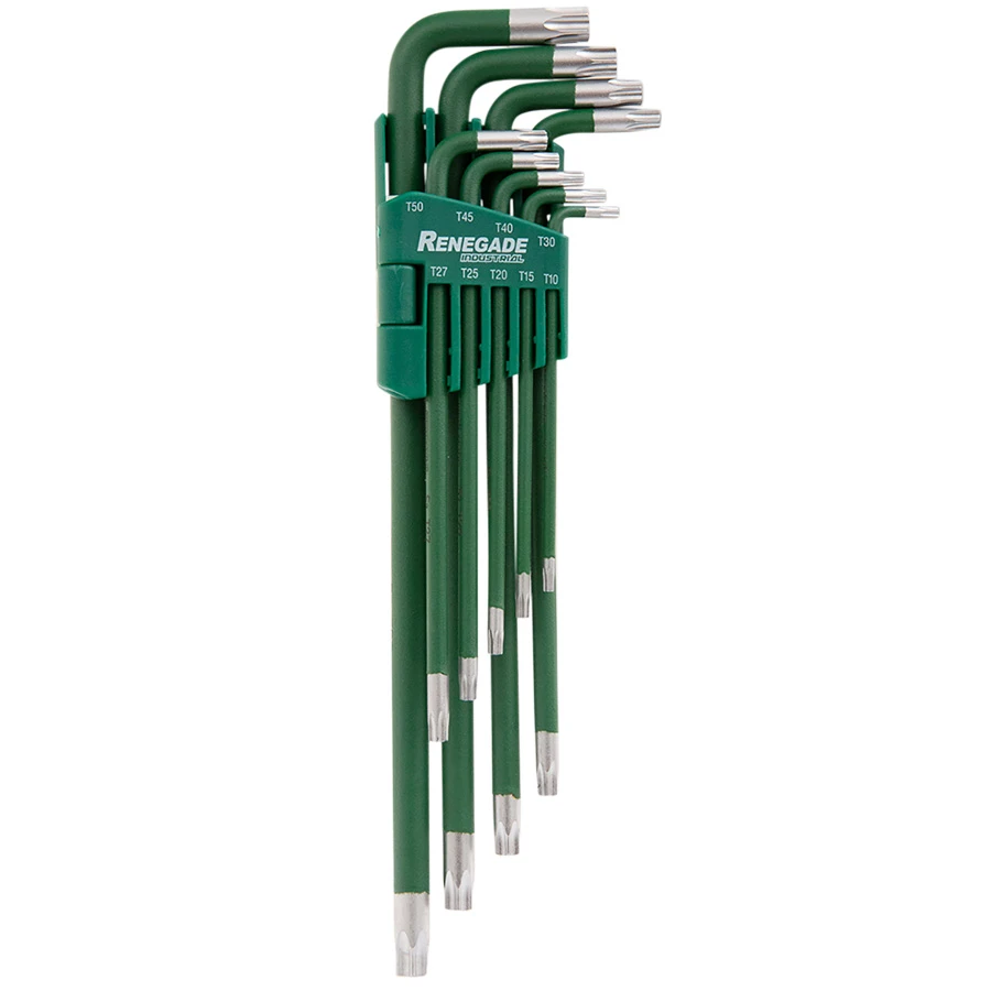 These Renegade Industrial Torx Key Sets are trade quality and feature an extra-long handle to give you that extra reach you need. Manufactured from Chrome Vanadium Steel with a high quality Powder coated finish, these tools are built to last. Sizes range from T10 to T50.