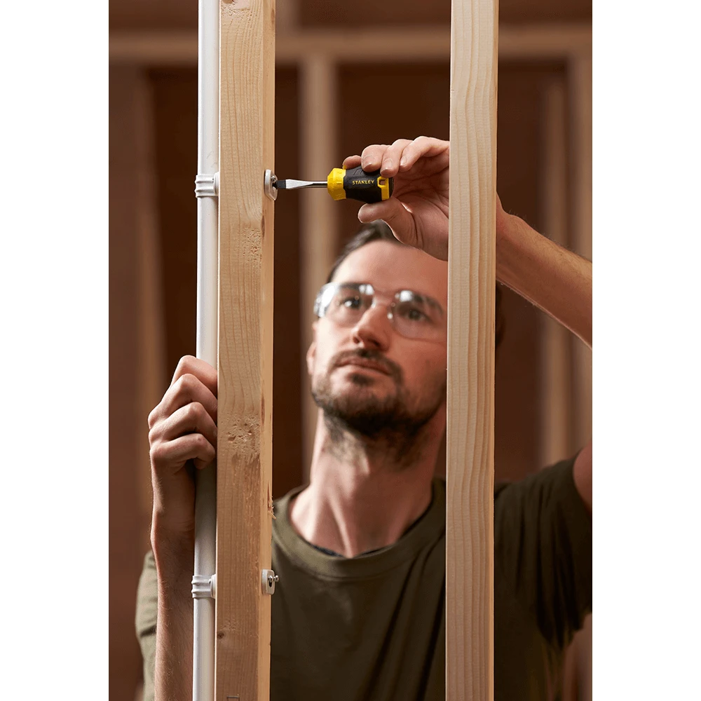 Constructed with an ergonomic, bi-material handle, the STANLEY Flared Stubby 6.5mm X 45mm CUSHION GRIP Screwdriver is built for exceptional comfort. Its unique 8-sided octagonal handle shape allows better grip, control, and torque transfer. Engineered from high-strength, chrome vanadium steel to reduce the chance of tip breakage, this high quality screwdriver is manufactured to the strictest standards and specifications and is suitable for demanding high torque applications within tight spaces. Featuring a strong magnetic black oxide tip, the STANLEY Flared Stubby 6.5mm X 45mm CUSHION GRIP Screwdriver is designed for improved screw retention, enhanced durability, reliability, and extended product life.