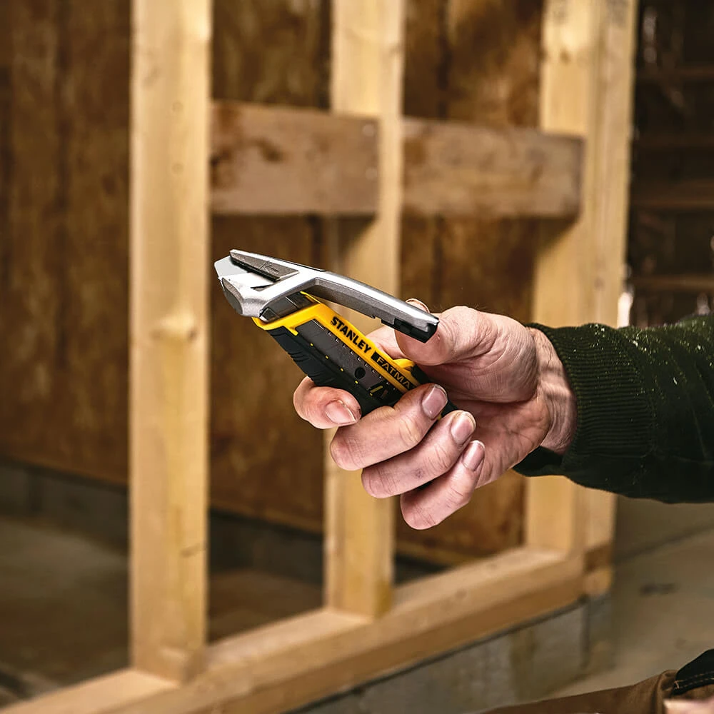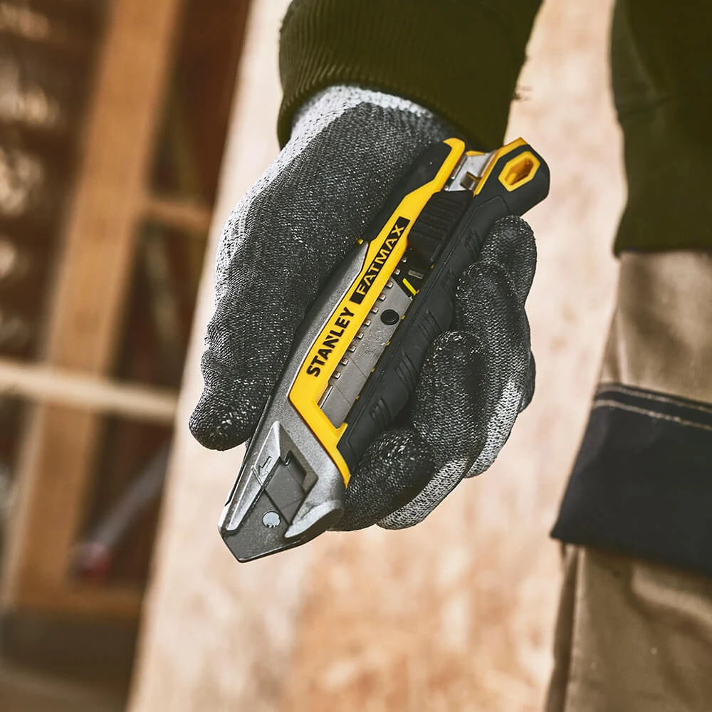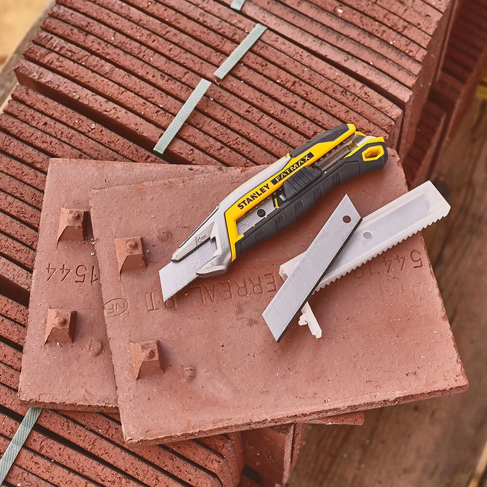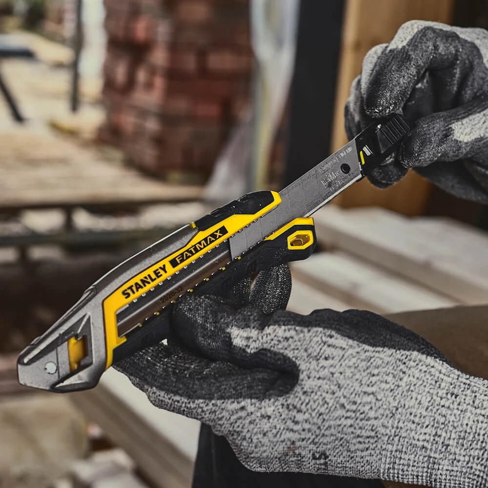 The STANLEY FATMAX 18mm Integrated Snap Knife features a unique blade-snapping mechanism which allows quick, easy and safer blade-snap. No need to use secondary tools to break and remove the blade – simply line-up the blade, snap it and continue cutting with a new sharp edge. Once the blade has been snapped, it’ll be retained by an integrated magnet for secure and convenient disposal. An on-board Snap Line Indicator helps to align the blade correctly to ensure clean blade-snap. The blade barrel is manufactured to the highest quality standards from hard-wearing stainless steel, delivering exceptional durability and longevity that you need every day on a job site. Furthermore, the product has been thoroughly assessed and drop-tested to 2m for impact resistance.