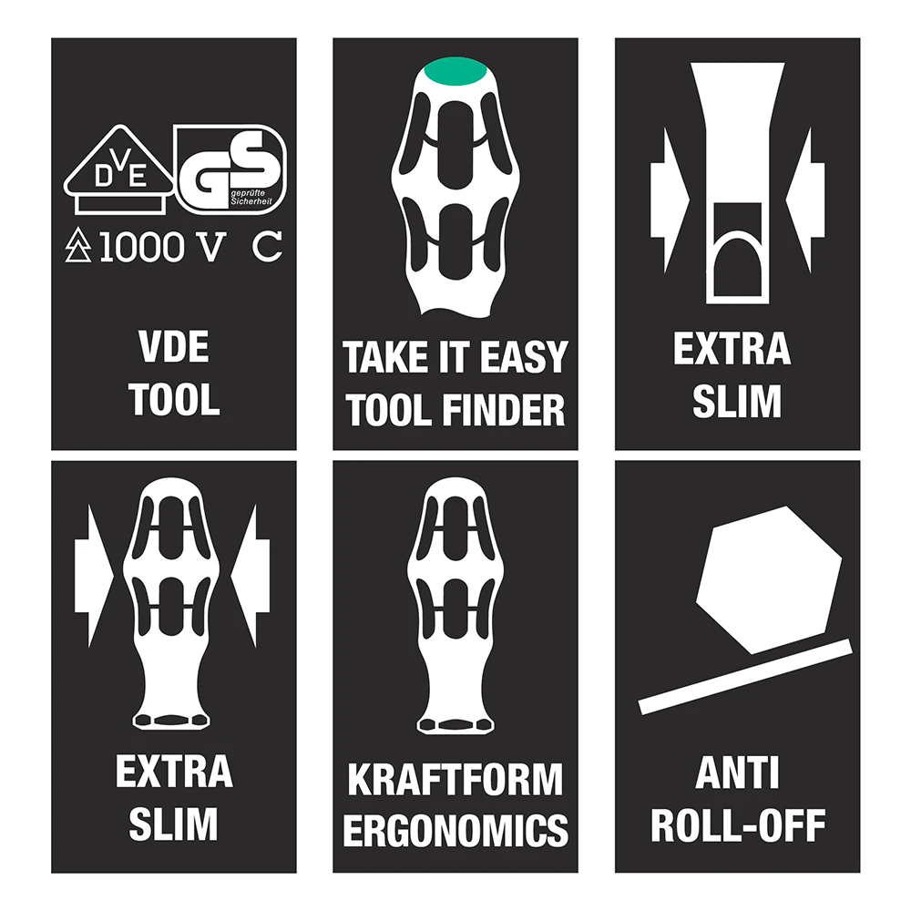 7 Wera VDE iSS screwdrivers with reduced shaft diameter as well as partially slimmer handle design to enable work in confined working situations & to allow low-lying screw & spring elements to be reached & actuated; individually tested tools as per IEC 60900; individual testing in a water bath at 10,000 volts so as to ensure safe working at the permitted voltage of 1,000 volts. “Take it easy” Tool Finder: colour coding according to profile & size. The anti-roll feature prevents any bothersome rolling away at the workplace.