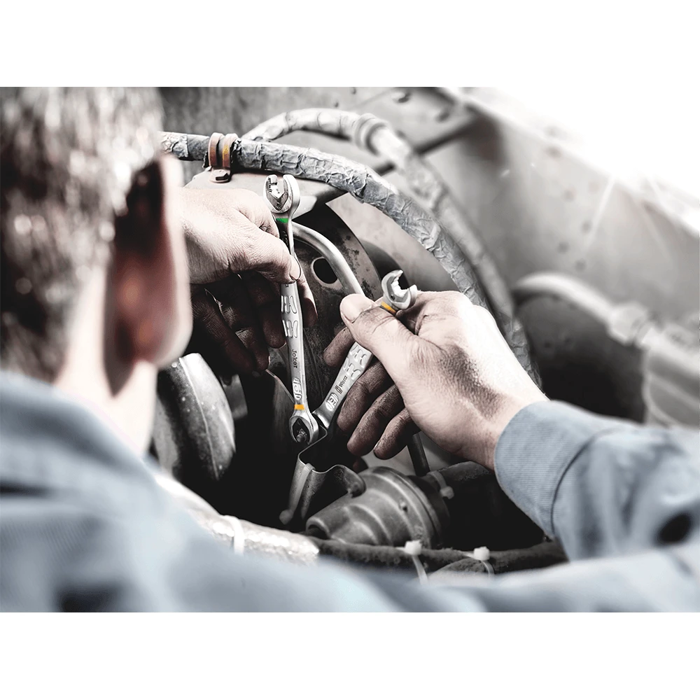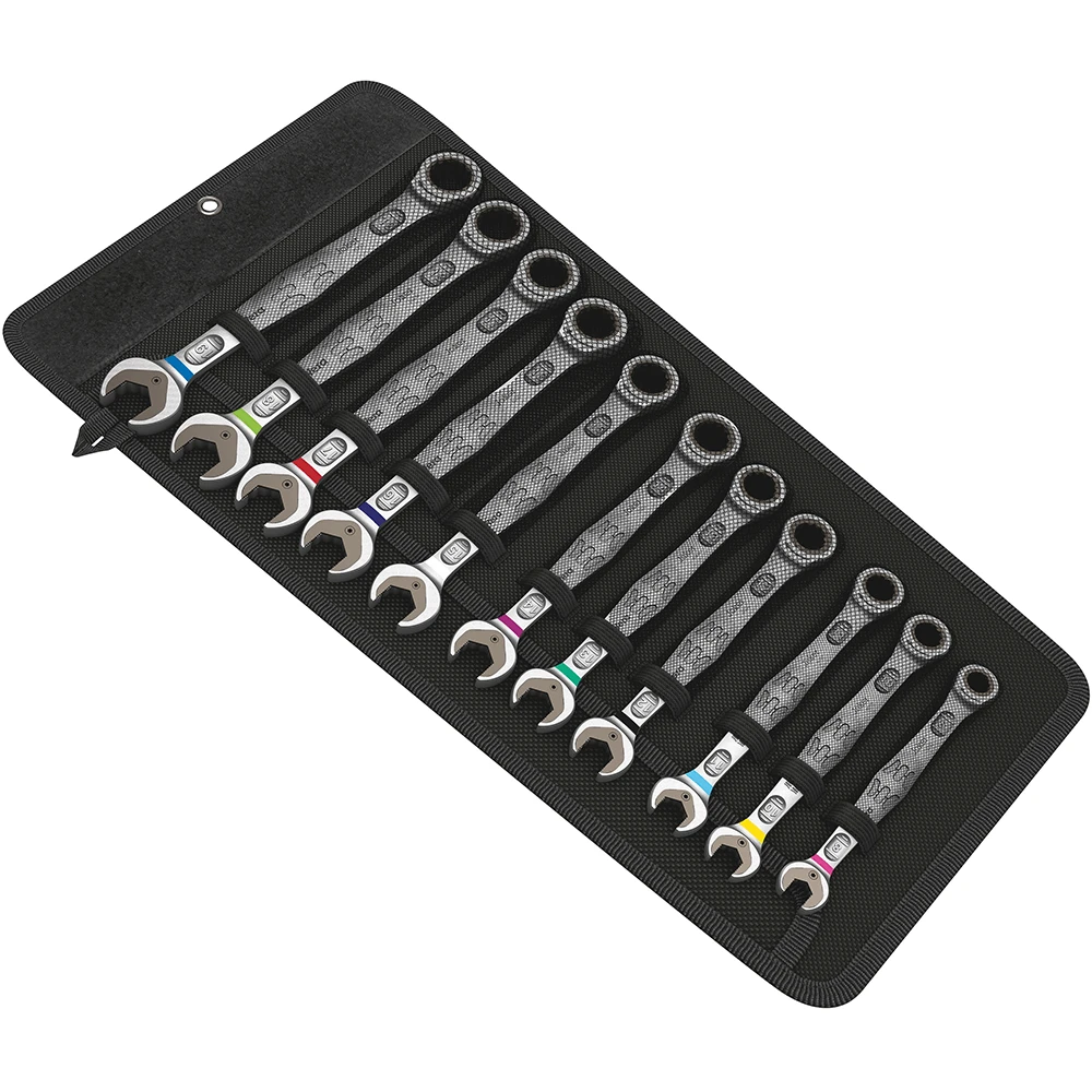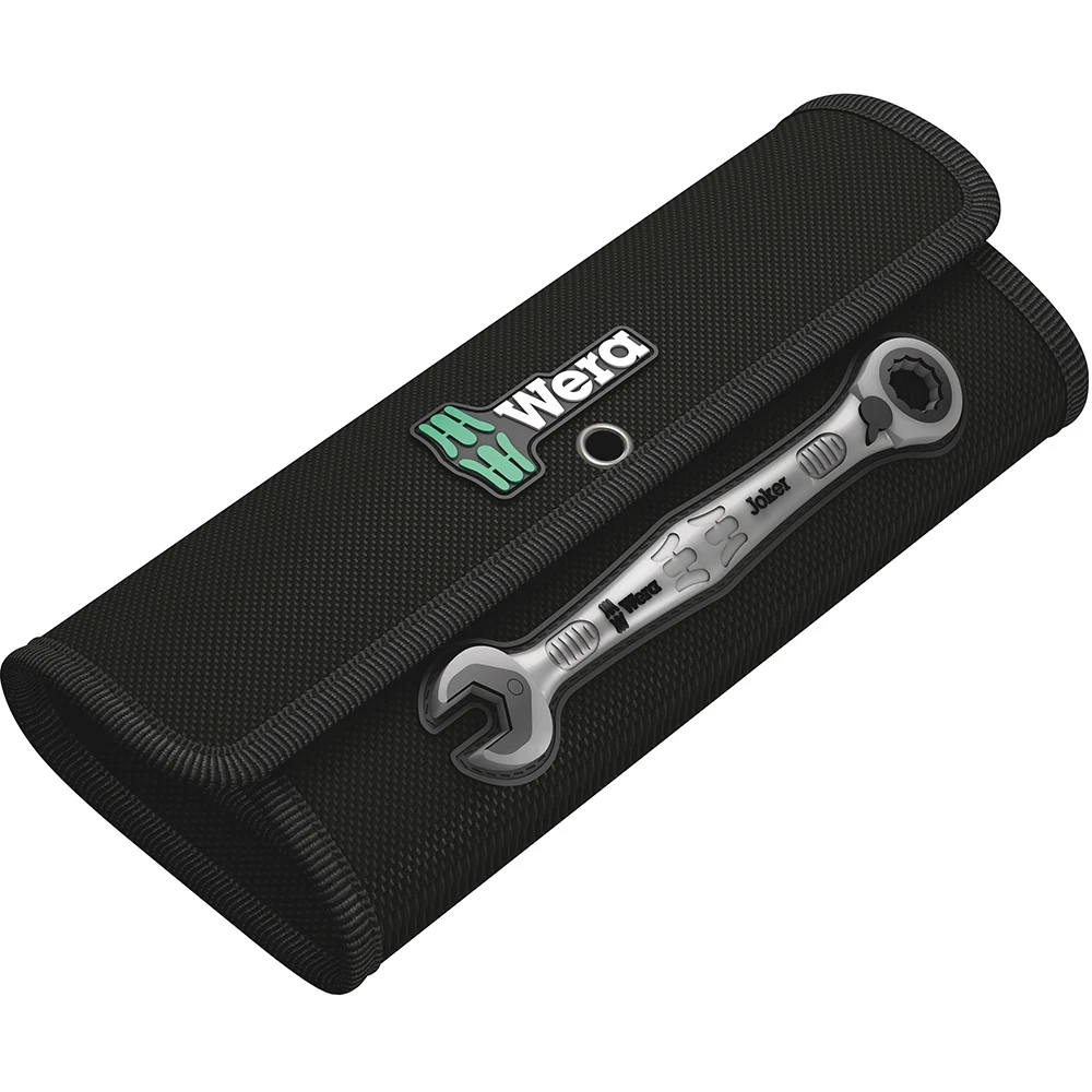 High quality combination ratchet wrench set by Wera: everything that a wrench has to be able to do. And a whole lot more. Faster, better, stylish. Yes, a real Joker. The new generation of combination ratchet wrenches. 11-piece set in a robust pouch. Suitable for hexagon bolt heads or nuts. Comes with a holding function, thanks to the metal plate in the jaw, which reduces the risk of dropping nuts & bolts. The replaceable metal plate in the jaw secures nuts & bolts with its extra hard teeth & limits the danger of slipping. The integrated limit stop prevents any slipping down around the bolt head & allows higher torque to be applied. The double-hex geometry makes for a positive connection with nuts or bolts & reduces the risk of slipping. A return angle of only 30° at the open end prevents any time consuming flipping of the wrench during fastening jobs. The ratchet mechanism at the ring end, with an exceptional, fine-tooth mechanism – 80 teeth in all – enables flexibility even in very confined working spaces. The specially forged geometry provides for high torque transfer & strength. Manufactured out of high performance chrome molybdenum steel with a nickel-chrome coating for high corrosion protection. “Take it easy” Tool Finder with colour coding according to sizes.