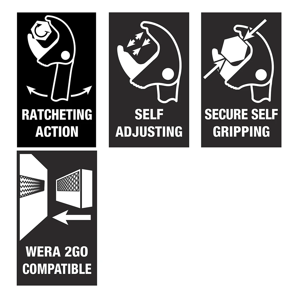Many users wish to have a universal screwdriving tool with the widest possible range of applications. It should be a single tool for multiple metric & imperial dimensions. It should automatically adjust to the different screw sizes. It should be safe to grab without damaging anything & should allow for high working speeds. With its continuous & parallel jaws the Joker 6004 replaces several single spanner sizes. The required size is automatically & continuously set when attaching the tool to the hexagon bolt or screw. The integrated lever mechanism securely clamps the hexagon screw or bolt between the jaws, which significantly reduces the risk of slippage or damage. The ratchet feature ensures fast & consistent screwdriving without removing the tool. By using the corner-width rectangular prisms, a return angle of only 30° can be achieved. The single-arm design, in conjunction with the ratchet feature & the corner-width prism, makes it possible to work even in confined spaces. The adjustable Joker 6004 is the universal screwdriving tool. Self-setting. Gripping. Spanning. 4-piece set for at least 18 different metric & imperial screw drives, comes in a compact folding bag. The Joker bags are suitable for attachment to walls, shelves, workshop trolleys & the Wera 2go system thanks to the hook & loop fastener system on the back.