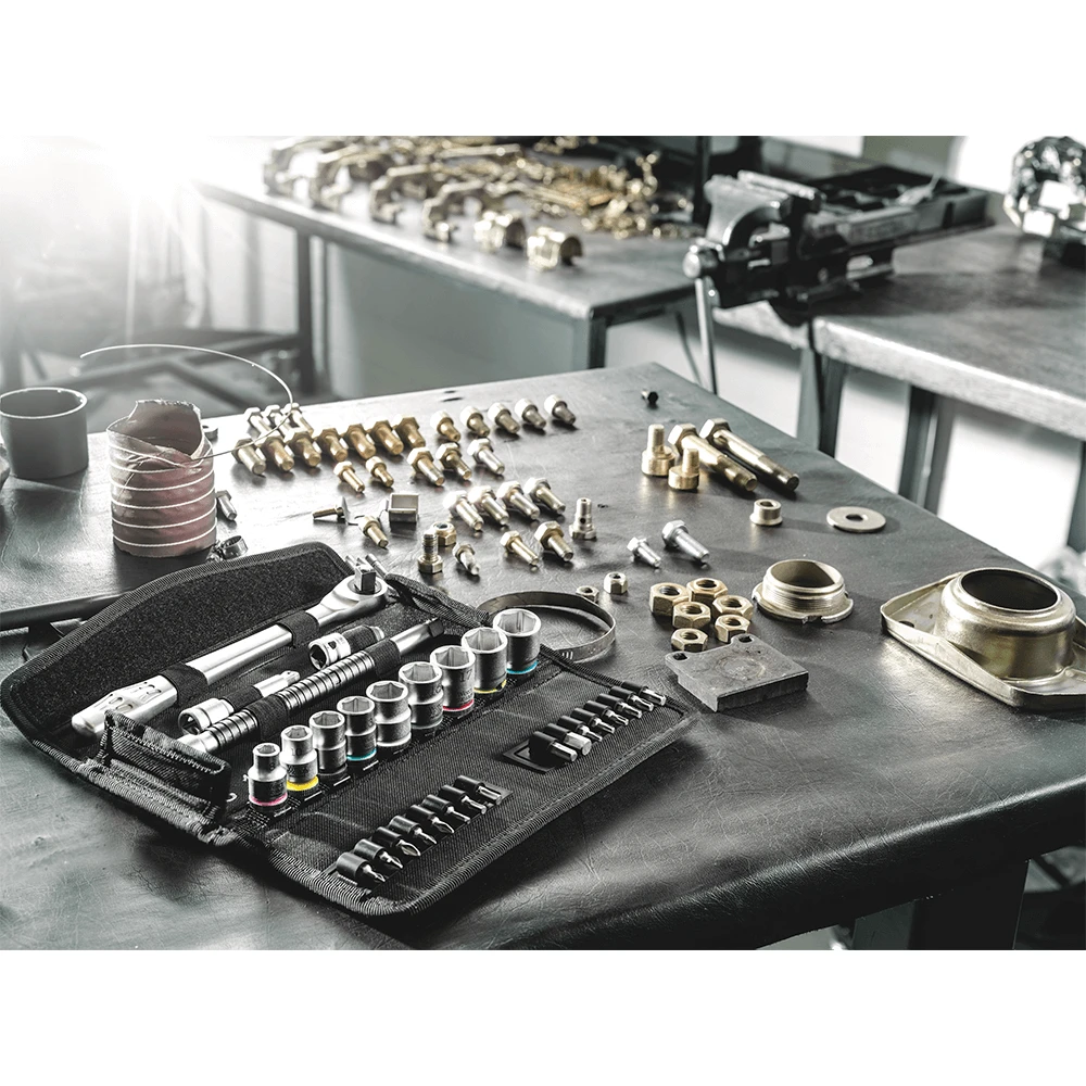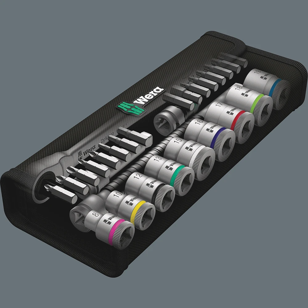 Incredibly compact set arrangement with many tools in a minimum of space. A completely new ratchet set feeling thanks to the unique textile boxes that are very robust & durable. They can be positioned upright for tidy storage on the workshop shelf. Additional surface protection due to textile outer material. Low weight & volume for simpler mobility. “Take it easy” Tool Finder with colour coding according to sizes.