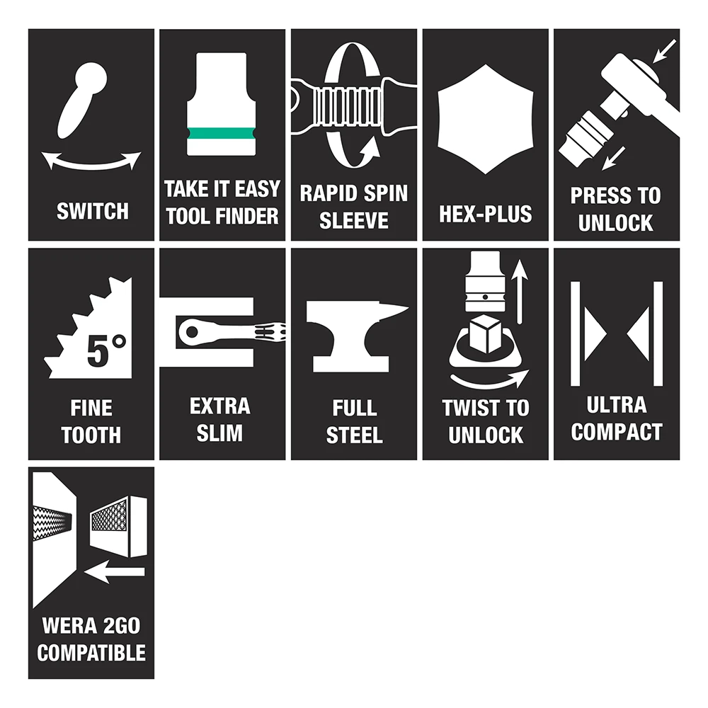 - Zyklop Metal Switch – Due to the ever-more confined working environment, space is becoming more & more an issue for the application of ratchets. Wera’s product developers therefore intensively occupied themselves with the issue of confined working spaces, & Wera has now solved this problem. The extremely slim & robust Zyklop Metal ratchet with a long lever was what emerged. When the change in direction needs to be quick, the Zyklop Metal Switch ratchet is the right tool. When the socket must not get lost & a coincidental change of direction has to be avoided at all cost, the Zyklop Metal Push is the correct choice.