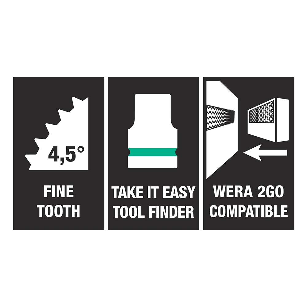 - Ratchet Function – The integrated ratchet with fine toothing (80 teeth) & a return angle of 4.5° eases & accelerates screwdriving without having to reposition the tool.